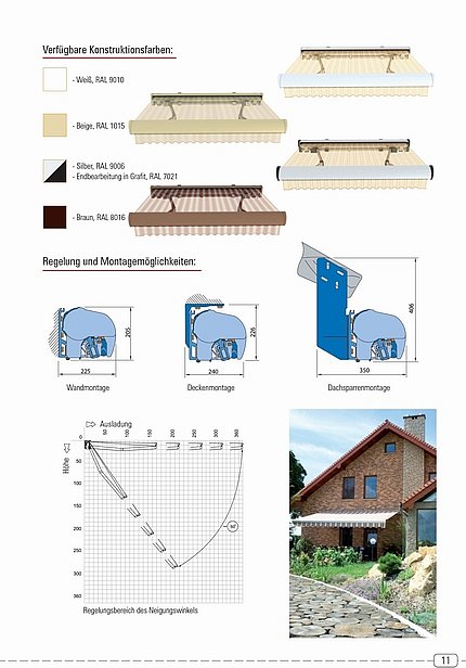 Dank den Wickelrohrstutzen kann das Markisentuch gleichmäßig gespannt werden. Kassettenmarkise Palladio wird auf einer quadratischen Tragbalkenkonstruktion befestigt und dadurch wird volle Funktionalität einer Hülsenmarkise mit leichte Montage angeboten. Die Markisenkonstruktion wird mit Pulvertechnik lackiert Lieferbare Konstruktionsfarben Weib Silber mit Endbearbeitung in Grafit, beige order Braun.